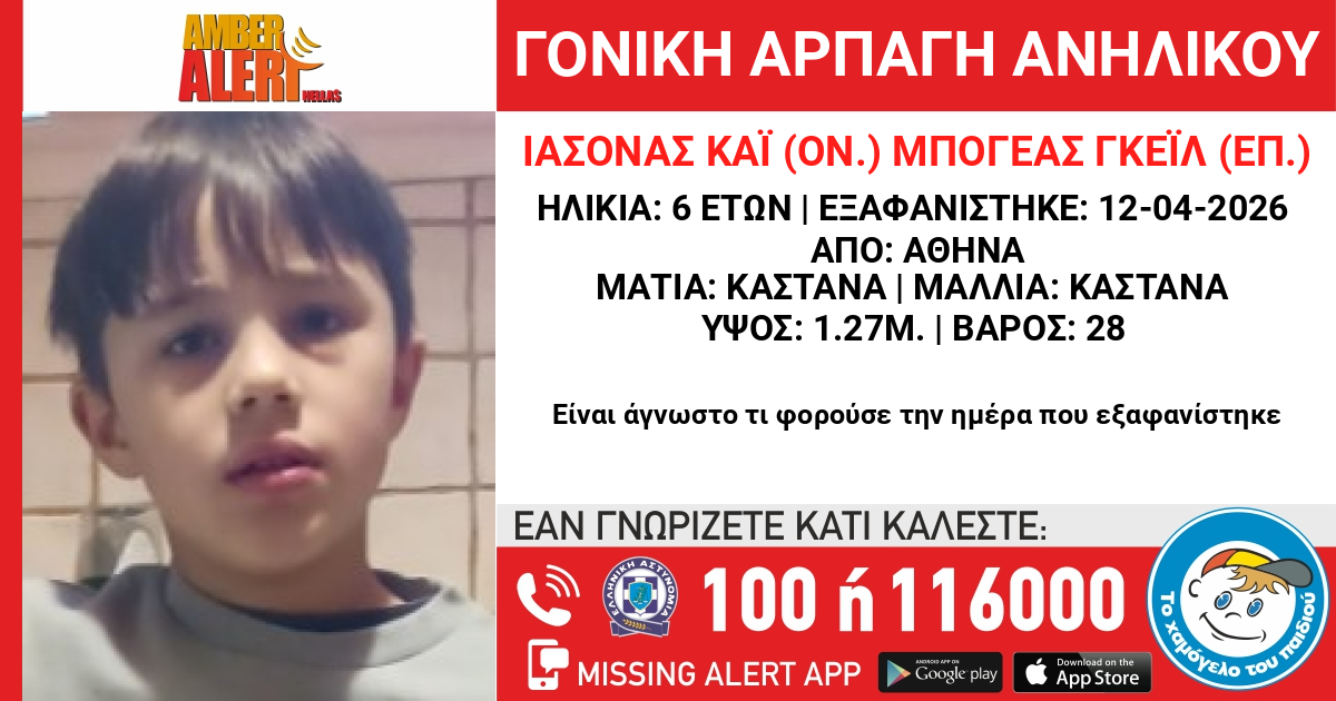Στις 12/04/2026 ο πατέρας του ανηλίκου προέβη σε αρπαγή του Ιάσoνα Κάι (ον.) Μπογέα Γκέιλ (επ.), 6,5 ετών, από την περιοχή της Βουλιαγμένης Αττικής και έκτοτε αγνοούνται. «Το Χαμόγελο του Παιδιού» προχώρησε στην ενεργοποίηση του μηχανισμού Amber Alert Hellas σήμερα, 13/04/2026, κατόπιν εισαγγελικής εντολής καθώς πιθανόν συντρέχουν λόγοι που θέτουν τη ζωή του ανήλικου σε κίνδυνο.