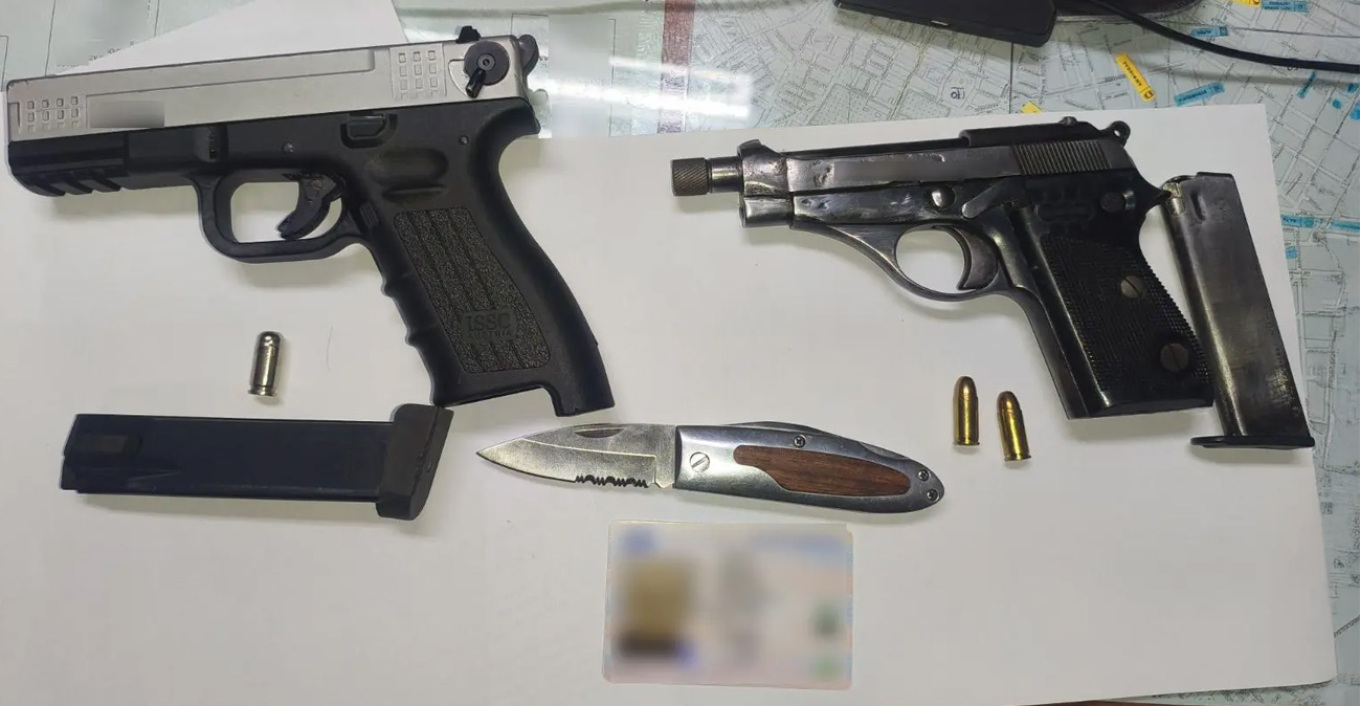 Κατά τον έλεγχο βρέθηκαν και κατασχέθηκαν δύο πιστόλια με τρία φυσίγγια, δύο γεμιστήρες, ένας αναδιπλούμενος σουγιάς, καθώς και πλαστή άδεια ικανότητας οδήγησης, στην οποία έφερε επικολλημένη τη φωτογραφία του συλληφθέντα.
